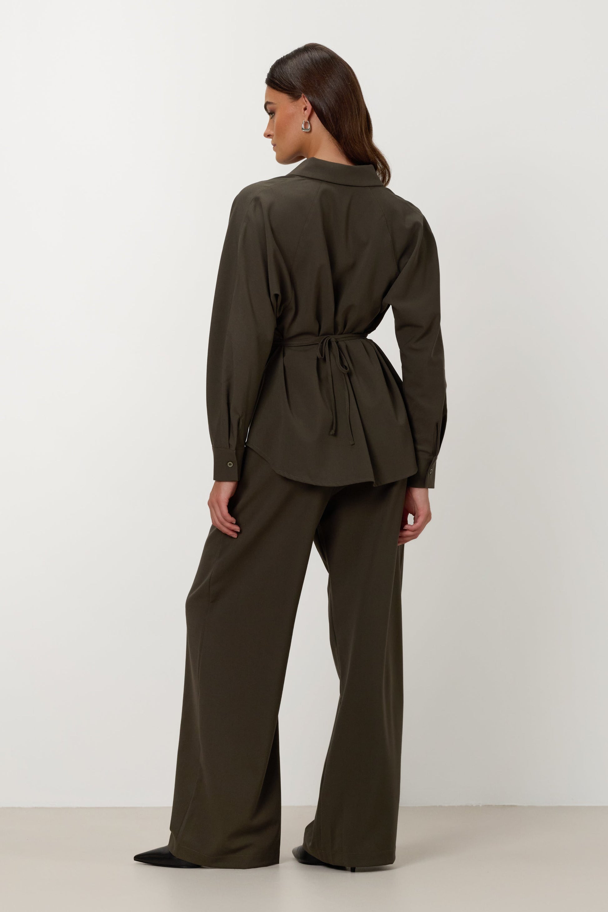 Relaxed-cut trousers crafted in a softly structured fabric with natural stretch, the look balances polish with ease. Front pleats lend quiet formality, while side slip pockets and back welt pockets preserve a streamlined finish.