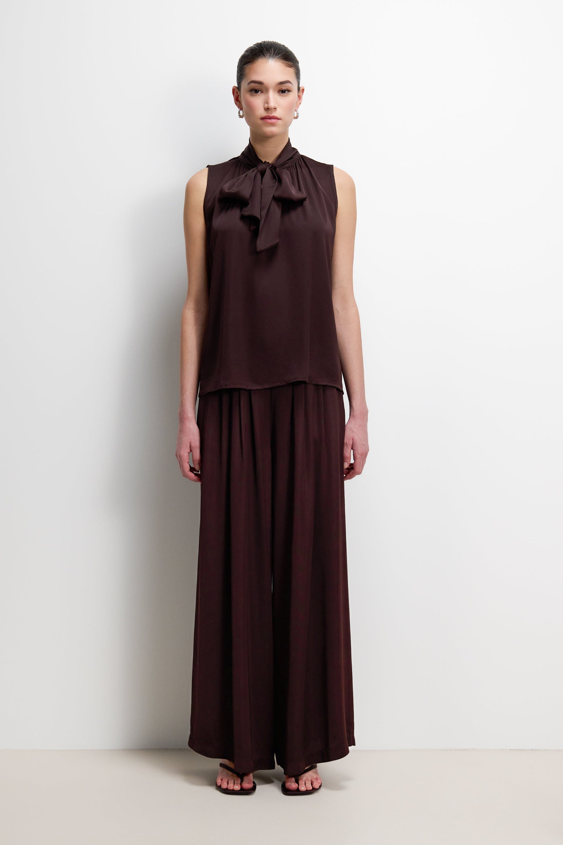Lyanne Bow Neck Tie Blouse | Espresso Brown Moire